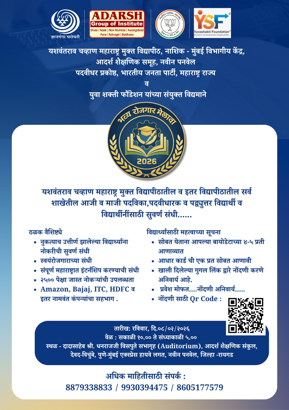 Job opportunities : नोकरीच्या शोधात असलेल्यांसाठी आनंदाची बातमी आहे. यशवंतराव चव्हाण महाराष्ट्र मुक्त विद्यापीठ, नाशिक -मुंबई विभागीय केंद्र, आदर्श शैक्षणिक समूह, नवीन पनवेल पदवीधर प्रकोष्ट, भारतीय जनता पार्टी, महाराष्ट्र राज्य व युवाशक्ती फाउंडेशन यांच्या संयुक्त विद्यमाने दि. 8 फेब्रुवारी 2026 रोजी सकाळी 10.00 ते सायंकाळी 5.00 दरम्यान दादासाहेब धनराज विसपुते सभागृह, आदर्श शैक्षणिक संकुल, देवद-विचुंबे, पुणे-मुंबई एक्स्प्रेस हायवे लगत, नवीन पनवेल, जिल्हा रायगड येथे भव्य रोजगार मेळाव्याचे आयोजन करण्यात आले आहे.